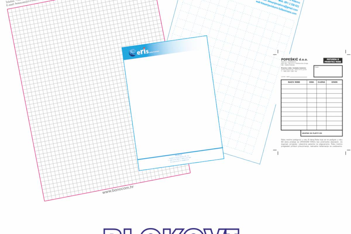 Izrađujemo blokove na offsetnom papiru obima od 50 do 100 listova.U formatima A4, A5 ili A6, kao i u drugim dimenzijama po želji narucitelja, sa jednom ili više boja tiska. Listovi mogu biti bižgani ili uvezani spiralom. Korice izrađujemo u offset ili digitalnom tisku ovisno o nakladi. Tisak korice moze biti u punom coloru, plastificirane (mat ili sjaj po želji). Blokove izrađujemo izuzetno kvalitetno i u kratkom roku.