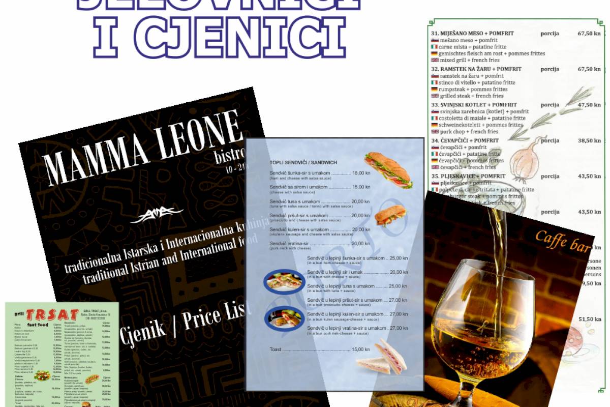 Ako imate kafić ili restoran, karta jela i pića (meni) je bitan dio imidža Vašeg ugostiteljskog objekta. Grafičko rješenje menija treba biti u skladu sa prostorom i mora korenspodirati sa ponudom koja se nalazi u meniju. Meni može biti samo jedan list veće gramature plastificiran obostrano ili knjižica sa koricama koje su presvučene kožom na kojoj je utisnut logo Vašeg ugostiteljskog objekta i sl.